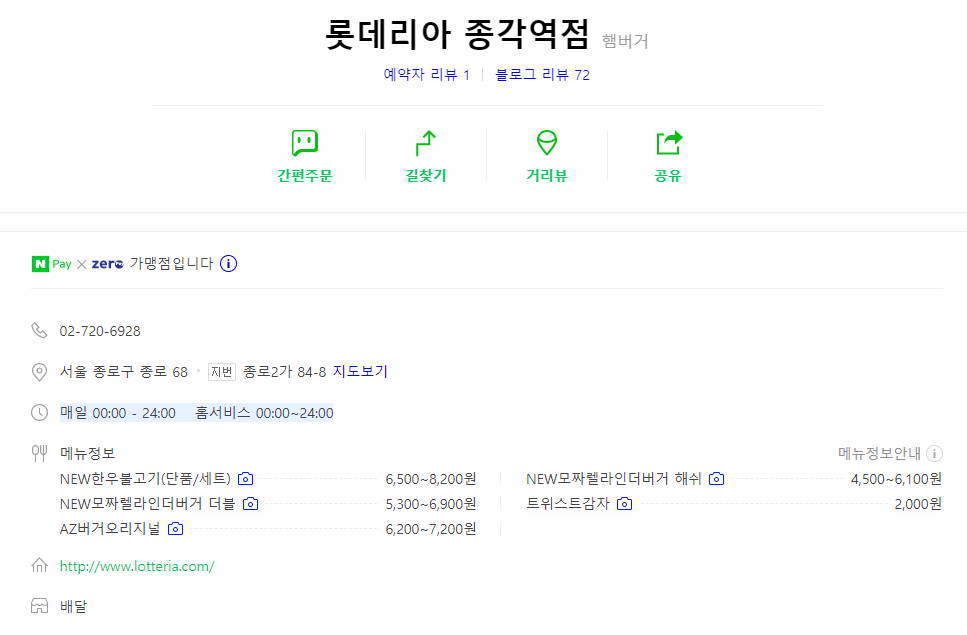 롯데리아 종각역점 영업시간